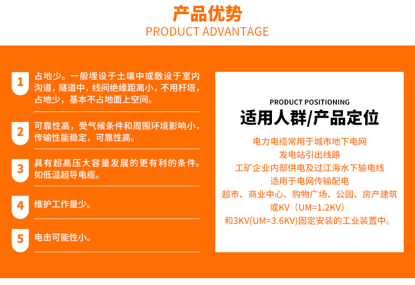 電力電纜是用于傳輸和分配電能的電纜,本產品適用于配電網或工業裝置中額定電壓1kV(Um=1.2kV)和3kV(Um=3.6kV)固定安裝的擠包絕緣電力電纜。電力電纜常用于城市地下電網、發電站引出線路、工礦企業內部供電及過江海水下輸電線。在電力線路中,電纜所占比重正逐漸增加。電力電纜是在電力系統的主干線路中用以傳輸和分配大功率電能的電纜產品,各種絕緣的電力電纜。